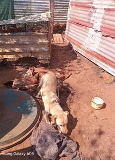 A dog was tied with a wire to a battered post, with no proper shelter, no sign of food and water.